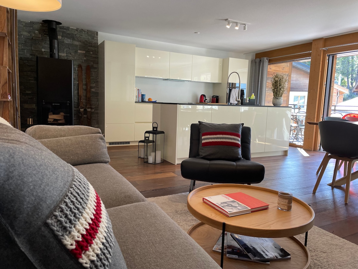 Mountain Glow Apartment – Modern och mysig i Täsch Fly till Alperna i denna eleganta, nyrenoverade lägenhet – perfekt för familjer, vänner eller par! 🛏 Sovplats för 6 | 🛌 2 bekväma sovrum | 🛋 Bäddsoffa | 🚗 Gratis garageparkering | 🍳 Fullt utrustat kök | 🌐 Gratis Wi-Fi | 🌄 Balkong med fantastisk utsikt 🚶♂️ 10 minuters promenad till järnvägsstationen, butiker och restauranger 🚆 Tåg till Zermatt var 20:e minut – enkel tillgång till skidåkning, vandring och utforskning av Matterhorn ✨ Mysiga vibbar ✅ Modern komfort ✅