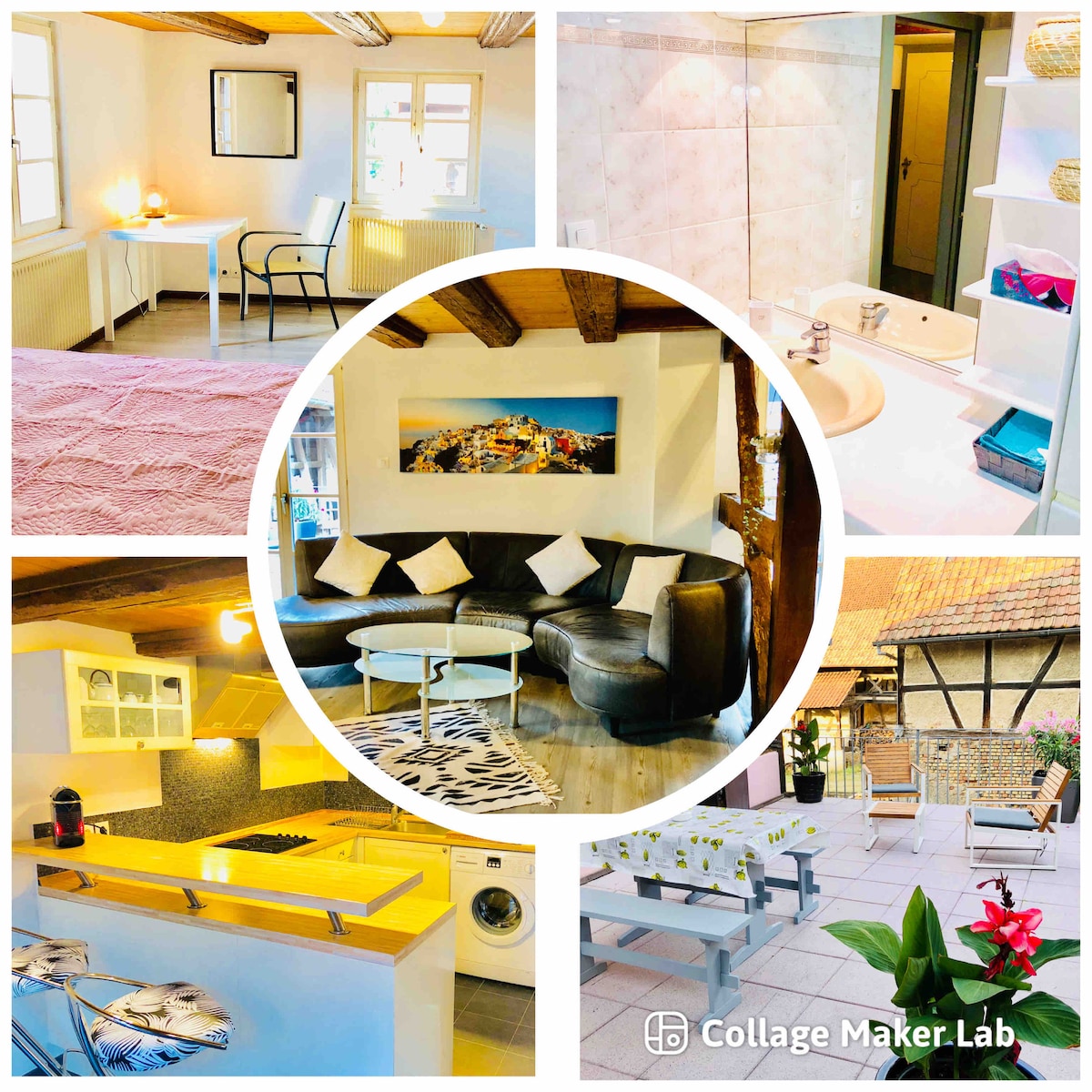 Oberoende boende på andra våningen (höger dörr) i vårt Alsace-hus från 1806 - mycket tyst mot rådhuset. Vackra synliga balkar, väldigt romantiskt mezzaninsovrum med utsikt över stadens centrum och klocktornet. Gratis höghastighets-WiFi, luftkonditionering, TV: & Amazon Prime Video, Netflix. Fullt utrustat kök och tvättmaskin. Euroairport Basel-Mulhouse 5,2 km, Basel 10 km, Weil-am-Rhein 17 km, Petite Camargue Alsacienne 6 km. Skyddad cykel-/motorcykelparkering finns på plats.