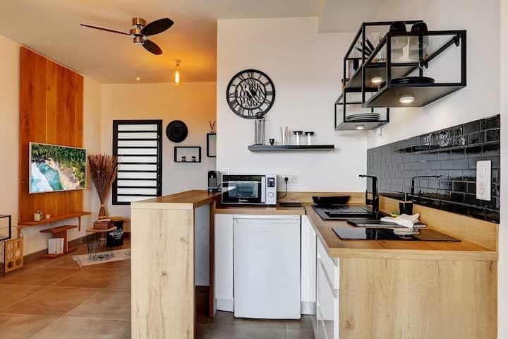 Underbar ny lägenhet, lugn, i en liten tropisk trädgård, i ett boende 3 minuters promenad från den vackra lagunen i eremitaget. 30 m² stor miljöansvarig lägenhet inredd med temat "Blå passionsfrukt" inklusive: ett välutrustat kök (diskmaskin, kylskåp, spis, mikrovågsugn), ett vardagsrum med soffa och smart-TV, ett badrum med italiensk dusch och en privat trädgård på 40 m2. Perfekt för en romantisk vistelse för 2. Högkvalitativa sängkläder (160 * 200) och handdukar tillhandahålls. Städning ingår. Tillgång till flygplatsen 40 min