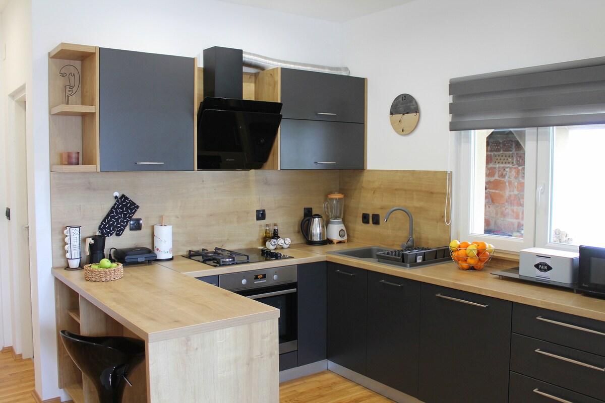 **Ny stenlägenhet nära havet med fantastisk havsutsikt**. Lägenhet 55 m2 för 2 + 1 gäster. Rymligt vardagsrum med bäddsoffa (smart-TV, luftkonditionering) Kök (ugn, diskmaskin, kaffemaskin). 1. Sovrum (stor dubbelsäng, bred garderob) med toalett (dusch). Lägenheten har en privat terrass (10 m2) med fantastisk havsutsikt. Terrassen innehåller ett bord för 4 personer.