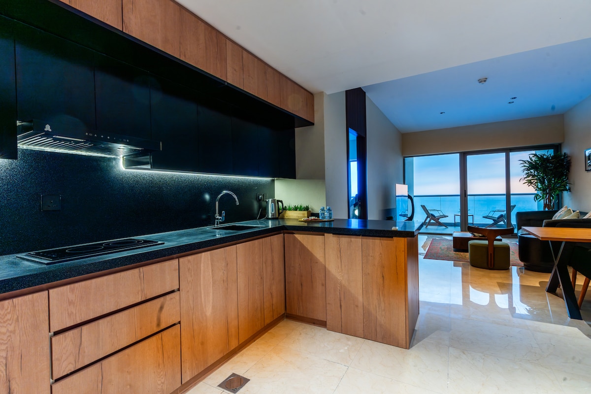 Njut av en lyxig vistelse på taket i en elegant bostad med två sovrum med ett rymligt vardagsrum, en privat uteplats, ett fullt utrustat kök och två rena, bekväma badrum. Designad med en modern touch och en lugn atmosfär för ultimat avkoppling. Idealiskt beläget nära Waterfront, Red Sea Mall och flygplatsen, med enkel tillgång till restauranger, kaféer och shoppingområden. Perfekt för familjer, par och affärsresenärer som söker komfort, avskildhet och ett utmärkt läge