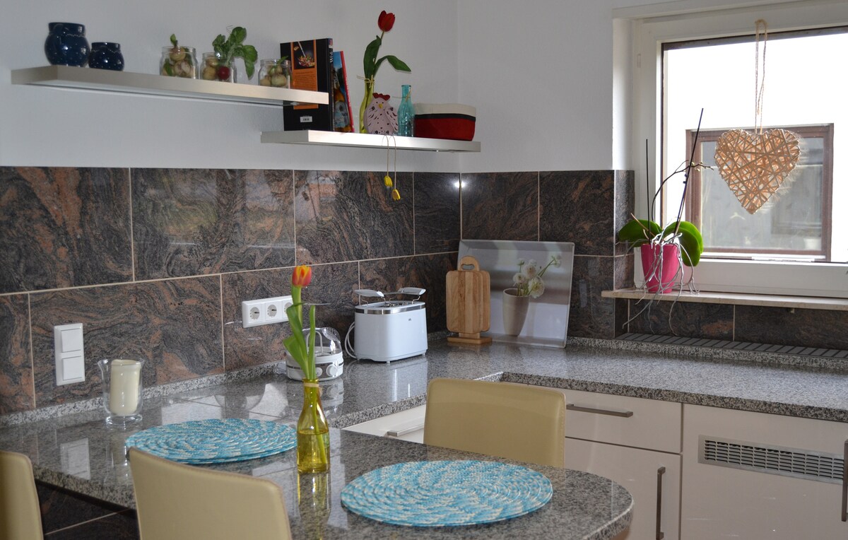 Lägenheten ligger i ett lugnt område, perfekt för aktiv fritid (vandring, cykling, golf 1 km bort och mycket mer). Europapark, Holidaypark, Tripsdrill, wellnessbadet Miramar i Weinheim, Heidelberg, Freiburg eller Strasbourg kan nås på 1 timme Karlsruhe ligger 5 km bort och är lätt att nå med buss (var 20:e minut).