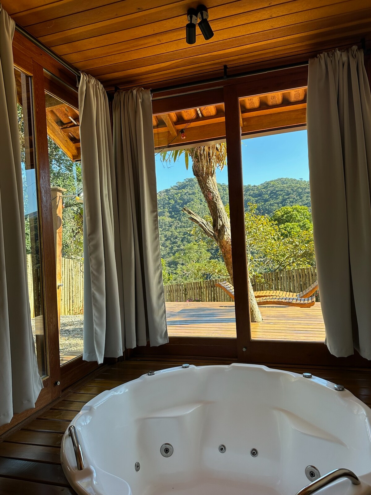 Stugan ligger i trädgården i mitt hem. Den kristallklara floden Pedras korsar trädgården med en bastu på stranden. Det finns ett vardagsrum, balkong som ger till skogen, med hängmattor, ett utrustat kök, ett bra varmt bad och en mezzanin - liten, en står inte på den, men väl luftad (två fönster), med en dubbelmadrass. Endast en extra person är möjlig (madrass i vardagsrummet). Öppen spis, ved som är nödvändig. Boa Net. Skogsmiljön är fuktig, olämplig för allergiker. Marknadsleverans. Uber vi serverar.
