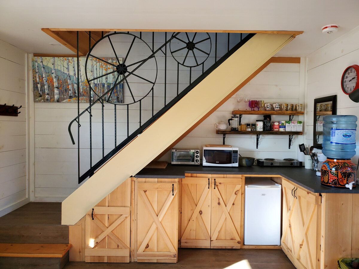 Denna stuga rymmer upp till fem personer (tvilling, dubbel och loft har en queen) Inkluderar liten köksenhet med minikylskåp, handfat (inget rinnande vatten men kanna med vatten tillhandahålls) och dubbel brännare spis. Köksredskap som ses på fotona är vad som tillhandahålls. Vi ber dig att inte ta med din egen diskmedel, för att skydda vårt ekosystem kommer vi att tillhandahålla det. SÄNGKLÄDER TILLHANDAHÅLLS INTE. VÄNLIGEN TA MED EGNA KUDDAR OCH FILTAR.
