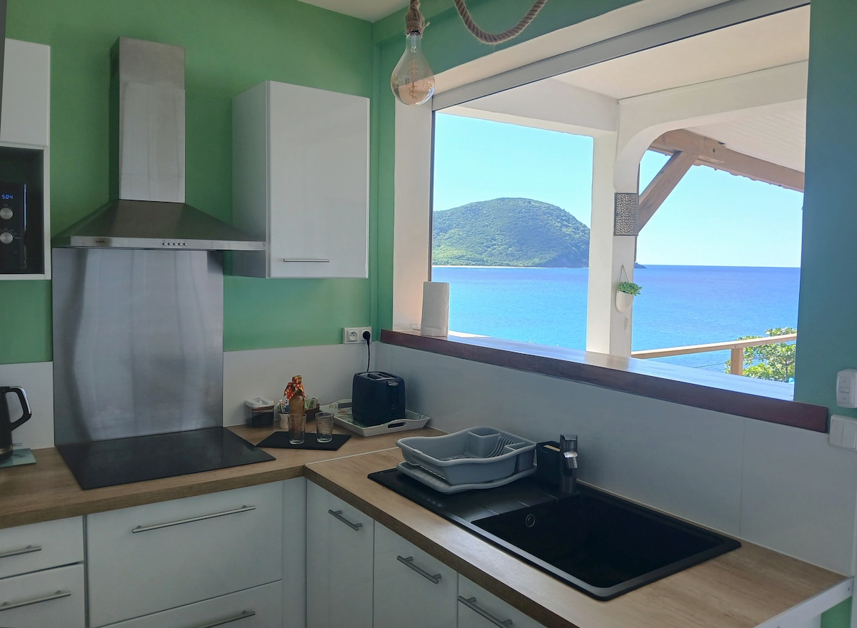 Maison , vue 180° sur mer des Caraïbes. Plage a 50 mètres. Cuisine toute équipée (plaque, micro-ondes, lave vaisselle, lave linge etc...), air conditionné dans les chambres, grande véranda de 50m2. Bar ouvert sur véranda. Deck avec solarium et barbecue. Chambres spacieuses avec rangements. 2 salles de bains, 2 WC. Salon et espace repas sur véranda. Wifi gratuit (fibre) Proximité route passante occasionnant en journée du bruit de voitures . Cet inconvénient disparaissant le soir et la nuit.