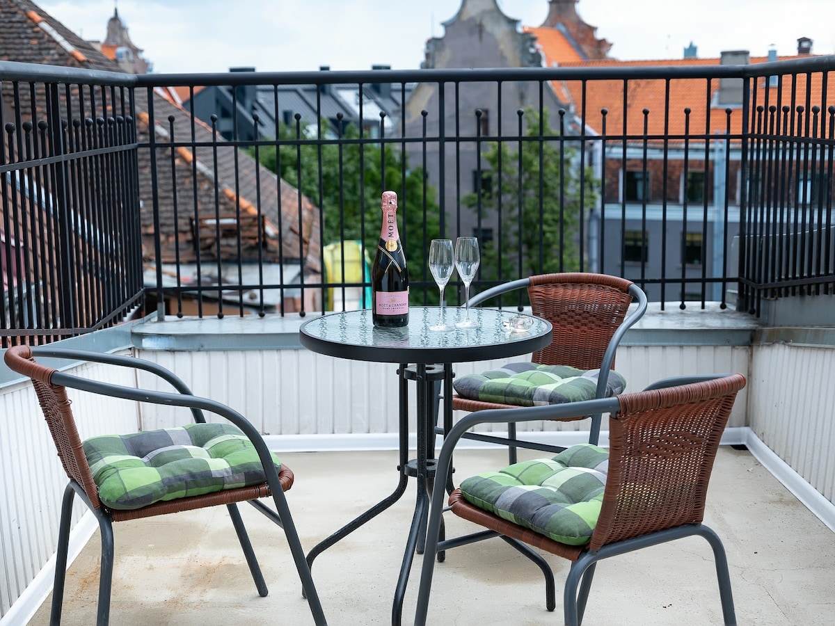 Lägenheten ligger mitt i hjärtat av gamla stan bredvid St.Peter 's Church. 120 (m)2 lägenhet med luftkonditionering. Vardagsrum med LED-TV komplimangerad av PS4 med flera spel. Lägenhet med två rum och 1 badrum som inkluderar bastu och bubbelpool. Bäddsoffa med plats för 2 personer. 15 (m)2 terrass med en fantastisk utsikt över Rigas gamla stad. Wifi, strykjärn, hårtork, handdukar, spis, kylskåp, vattenkokare, tvättmaskin, diskmaskin. Hiss, 6: e våningen , självständig incheckning från 16:00.