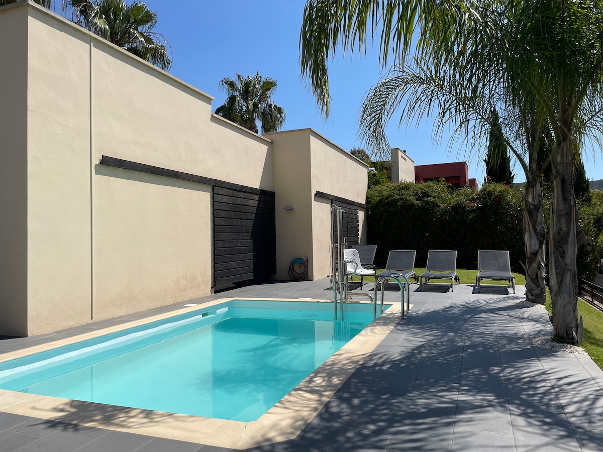 Ett unikt och tyst utrymme med litet oberoende hus, ett sovrum och vardagsrum, dubbelsäng, nya sängkläder, duschrum, kök, luftkonditionering, privat terrass, havsutsikt utsikt över bergen. Detta hus ligger i ett litet B&B med en avkopplingsplats vid poolen, med spa, bastu, solstolar, fiberoptiskt Wifi och lugn i en lummig trädgård, perfekt för naturälskare. Observera att inga barn är tillåtna. Turistlicensnummer VUT/MA/87909