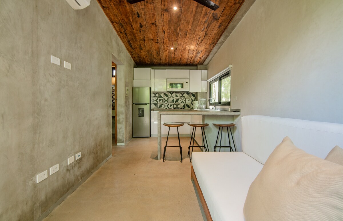 Denna nischlägenhet erbjuder allt du kan behöva. Med ett luftigt öppet utrymme är loftet perfekt för ett par eller en liten familj. Det mest intima och även det enda självförsörjande rummet med ett fullt utrustat kök i vardagsrummet och en privat utomhusterrass, privat trädgård och uteservering. Detta rum har ingen pool, men du har tillgång till poolen på strandklubben. Kolla in oss i @aurea.nica