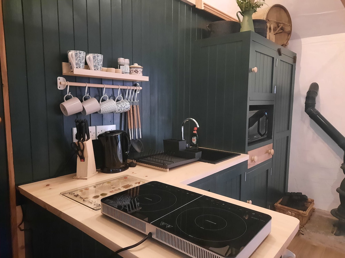 Stugan ligger vid vårt hem och lilla självfinansierade veganska/vegetariska fristad på en kulle, inbäddad i sin egen lilla vilda naturträdgård och utvecklar matskog av frukt, nötter och vilda ätbara. Vi har utvecklat hela vår plats till ett spårsystem, även känt som Paradise paddock. Möt några av våra räddningsdjur. Sitt vid lägerelden och njut av utsikten över den omgivande landsbygden. Det är ett bra ställe att njuta av lugn och ro i irländska Midlands och omgivande län.