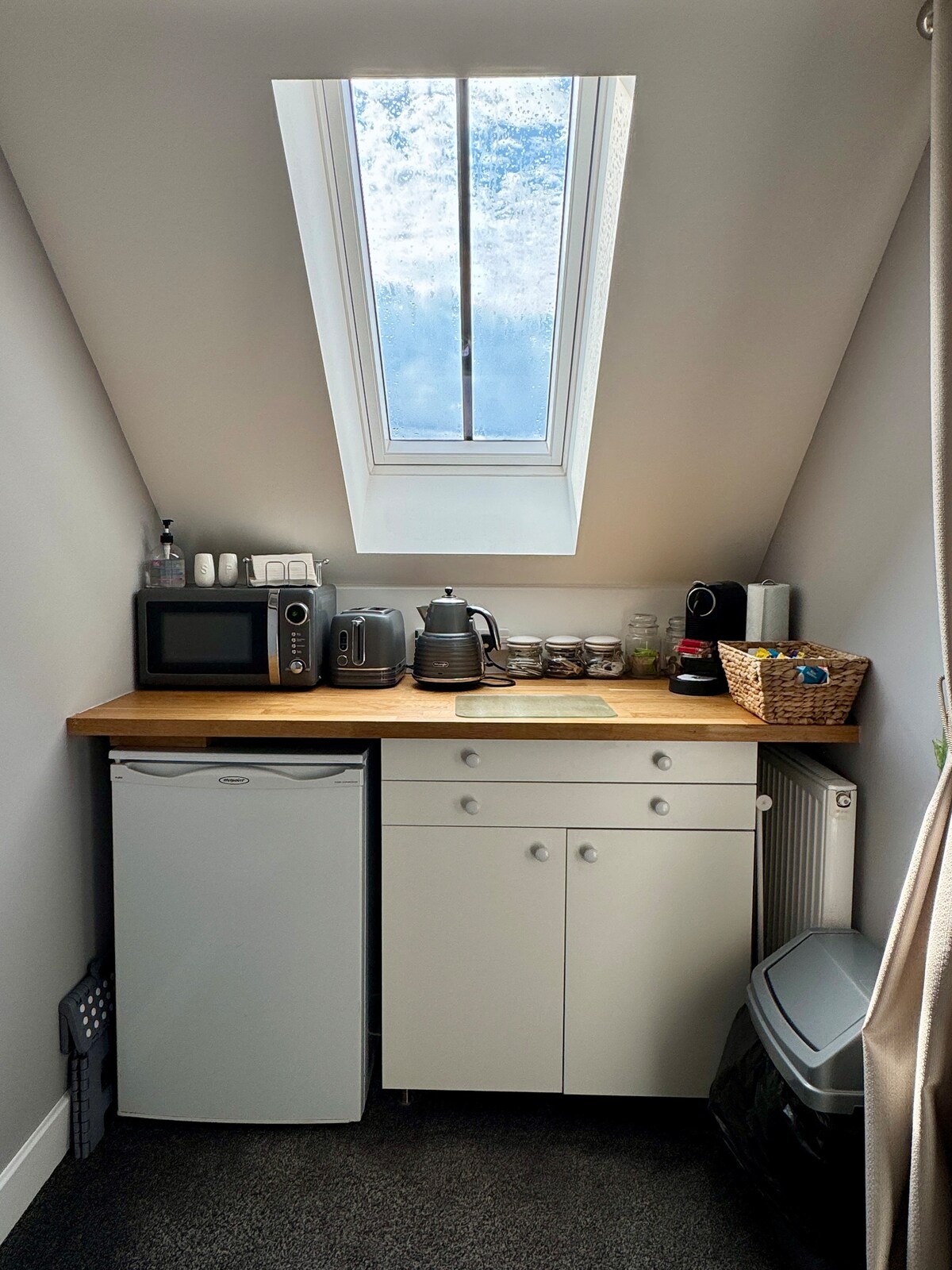 Denna härliga öppna plan loftlägenhet ligger i Woodthorpe, en charmig by i utkanten av Loughborough. En fem minuters bilresa till Loughborough eller universitetet. Loftet har utsikt över Beacon Hill och kan gå direkt ut på landet. Den ligger på en landsväg som inte är en genomfartsväg så mycket tyst. Boendet har ett litet pentry med mikrovågsugn, två ring induktionshäll, stekpanna och kastrull. Kylskåp, diskbänk, vattenkokare och tallrikar, skålar och bestick.