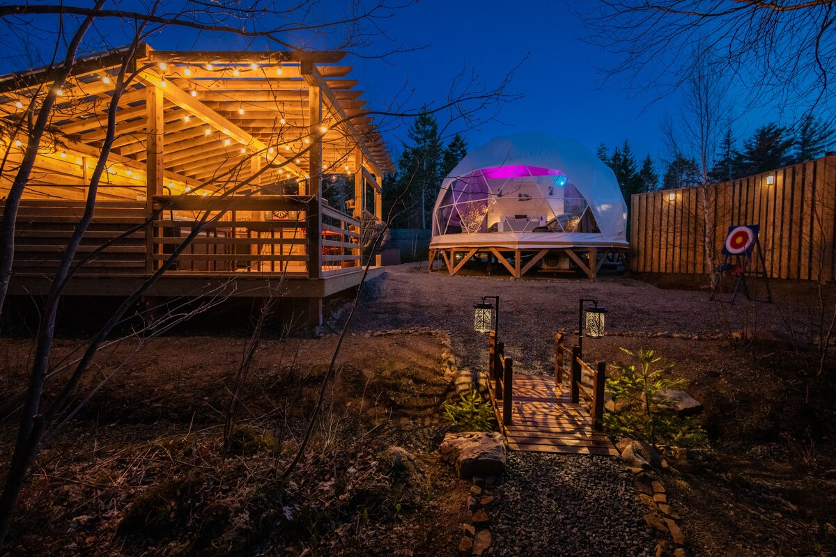 Njut av och koppla av i vår helt nya fullastade lyxiga Glamping Dome! Vi lade till en liten touch av lyx och rustik lägerkänsla. Ha en trevlig vistelse! Under vistelsen har du privat tillgång till Kanadas populäraste spa med bubbelpool, Hydro Pool Model 395 KLIMAT🌞❄️ Denna kupol är utrustad för alla typer av kanadensiska klimat! Med en Mini Split för uppvärmning/kyla, och uppvärmda golv (används inte under sommartid) för de brr kalla vintrarna