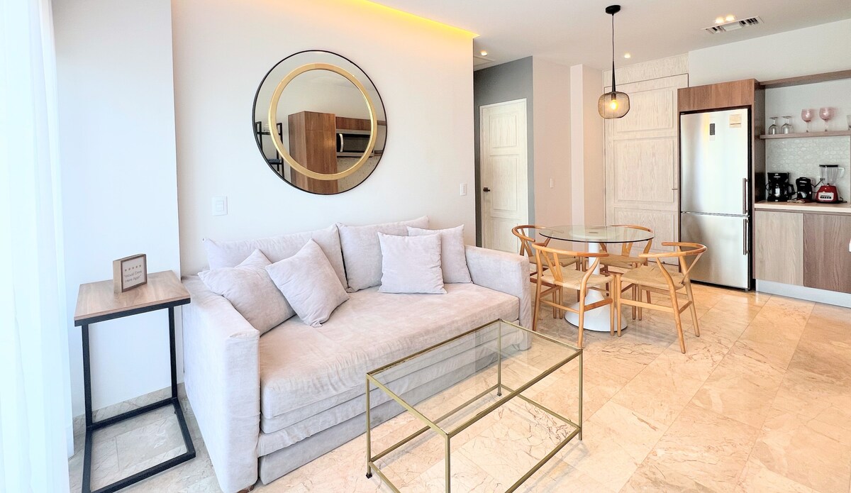 Insta gram Star Luxury Studio, RESIDENCIA ART PROJECT CONDOS ligger på den bästa platsen i Playa del Carmen, den vackra 38th Street mellan den världsberömda 5th Avenue och Karibiska havet. Detta underbara läge gör det möjligt för sina gäster att njuta av en kort och avkopplande promenad ner till stranden. Takterrassen som ligger på toppen av byggnaden har 2 spektakulära pooler, ett skybarområde och ett gym med havsutsikt