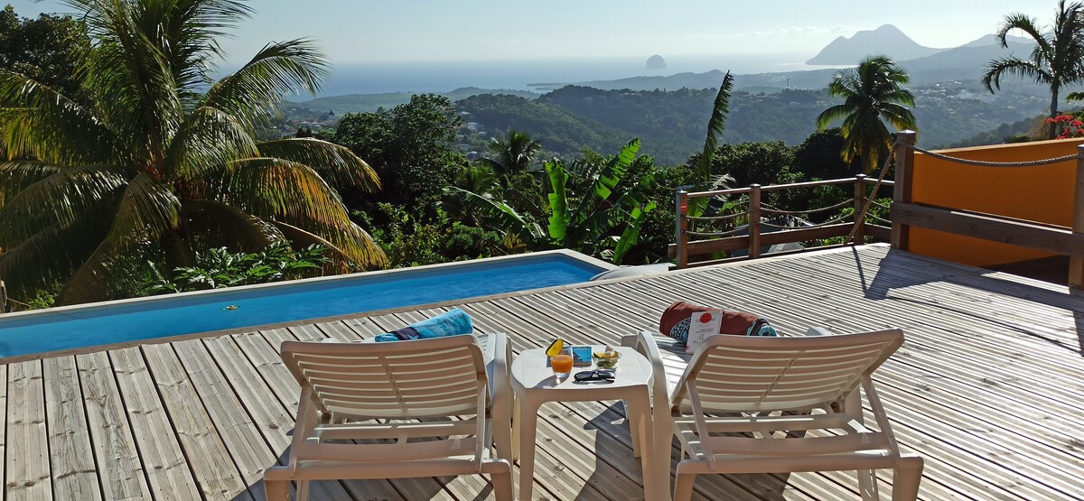 Résidencestamarin erbjuder dig denna fantastiska 200 m² stora villa som passar familjer eller fyra par. Utsikten från din terrass eller däck är hisnande. Villan "Tamarin" kan bokas i sin helhet (nedre och övre villa), för upp till 14 personer. 2 km bort har du valet av den lokala marknaden eller köpcentra, bagerier och konditorier. 15 minuter från stränderna och turistattraktioner i söder, 13 km från flygplatsen och 21 km från Fort de France.