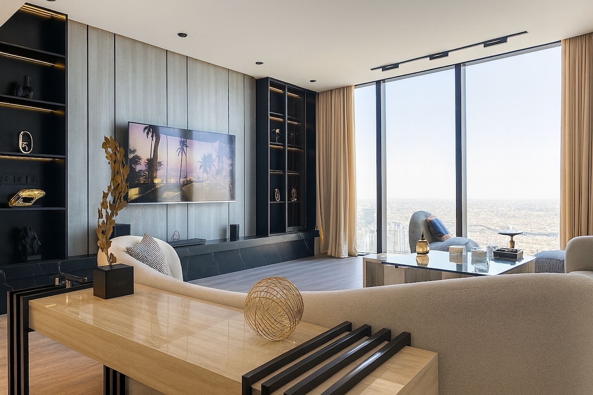 Apartment in Burj Rafal (owner's residence), 50+ floors, a northern view, for those looking for quiet and distinguished accommodation, near the most prominent landmarks of Riyadh. Fully equipped, designed and furnished with luxurious personal furniture; includes a bedroom with a master bed, a kitchen, (2) bathrooms. cinematic lighting, a washing machine, coffee machine, a 75-inch TV & large screen in the bedroom, air purifier filter, Kitchen tools to spend a period of stay in complete comfort.