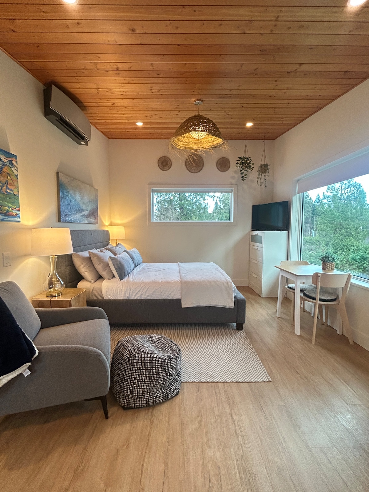 Vår licensierade svit med havsutsikt (byggd 2022) ligger centralt på Sunshine Coast i West Sechelt. Det är 5 minuters bilresa (20 minuters promenad) in till staden med busshållplatsen 2 minuter från ytterdörren. Luta dig tillbaka och koppla av på den rymliga uteplatsen där du kan njuta av vår gaseldskål, Weber BBQ och bakgården efter en dags utforskning. Vår privata svit med ett sovrum har en queen size-säng, en utdragbar bäddsoffa, en smart 50-tums-TV, höghastighetsinternet via fiberoptik och luftkonditionering.