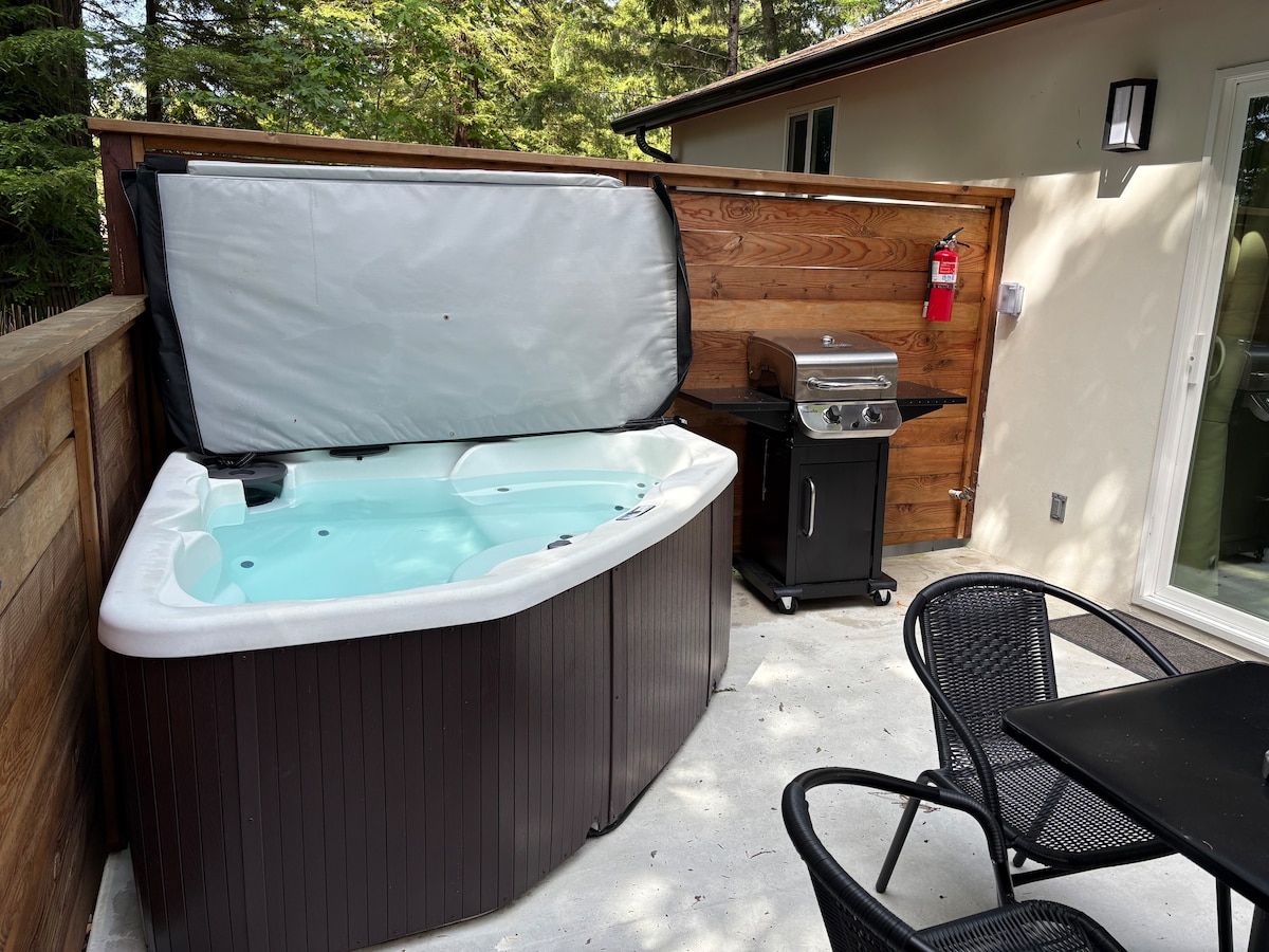 Ombyggd modern stuga inbäddad i en privat redwoodlund nära den södra änden av den världsberömda "Avenue of the Giants" i staden Miranda. Perfekt plats för avkoppling och vila efter en lång dag av aktiviteter. Njut av den stora, lyxiga kakelduschen med stort regnduschhuvud och 6 kroppssprutor, premium säng och sängkläder, fullt utrustat kök med alla nya apparater inklusive en Breville Vertuo kaffemaskin med kaffekapslar och te urval. Pvt inhägnad uteplats med gasolgrill och bubbelpool