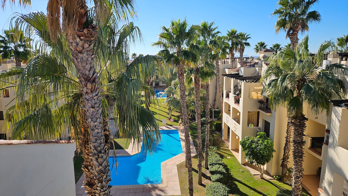 Enjoy quality time with family or friends… or simply spend a peaceful time alone in this beautiful apartment at Roda Golf, just 15 minutes from Los Narejos beach. The space features three bedrooms, two bathrooms, a terrace, living and dining areas, swimming pools, a children’s play area, a golf course, and breathtaking sunsets from the terrace. The complex also offers a restaurant, gym, and green areas.