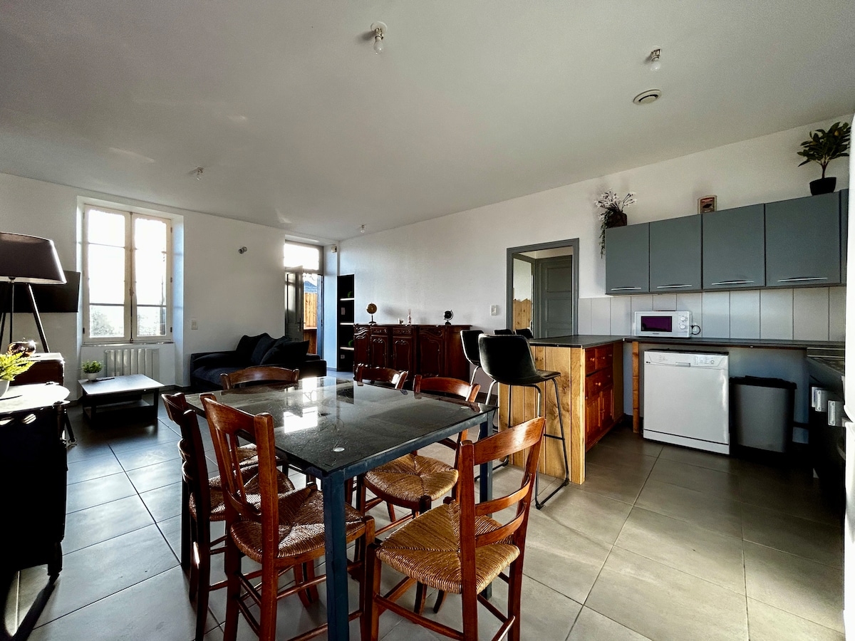 Koppla av i detta lugna och eleganta boende. Det är isolerat i slutet av byggnaden (gammalt 1800-talshotell som jag renoverar...) vilket kommer att ge dig fördelen av absolut lugn!! En stor privat terrass kommer att göra detta ställe ännu mer isolerat... Njut av SPA och stämningsbelysning för att ladda batterierna. en plancha och trädgårdsmöbler perfekt denna intima terrass.