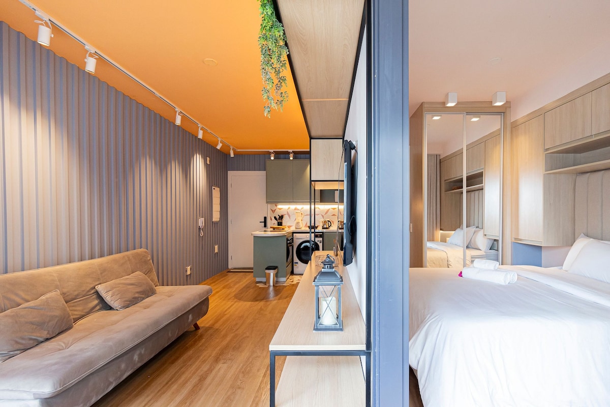 Denna eleganta 50 m2 lägenhet ligger på Bela Vista, har 24 timmars dörrvakt. 2 sovrum (endast 1 med luftkonditionering, och queen-säng, den andra är ganska liten och kan användas som ett kontor, passar en dubbel storlek bäddsoffa) och 1 badrum. Med fantastisk utsikt från varje fönster är det ett bra ställe att arbeta och koppla av. Det privata jetrör på balkongen är en fantastisk plats att njuta av stadsutsikten. Parkering — kabel/smart-TV, kylskåp med ismaskin, ugn, tvättmaskin och torktumlare, spishäll, mikrovågsugn, diskmaskin och ultrasnabbt internet.
