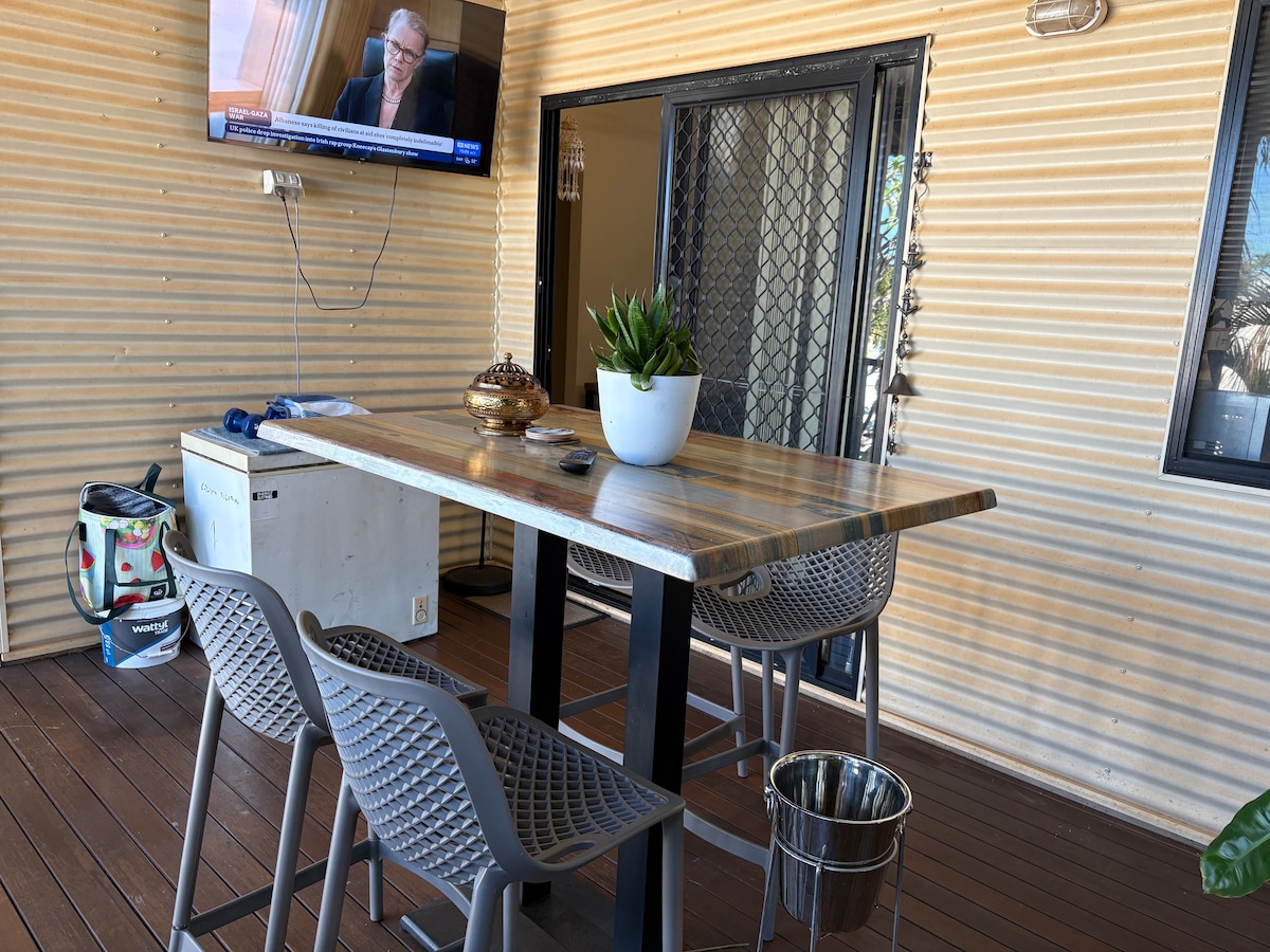 detta rymliga och udda boende ligger i hjärtat av Broome och erbjuder hela översta våningen för gäster. Det stora sovrummet har en lokalt utformad queen-säng i trä. Det har ett fläckglasfönster/vägg och en solid Jarrah-dörr . Kroken under det sluttande taket har två enkelsängar. Matplatsen och vardagsrummet har utsikt över omgivningarna genom stora fönster och pentryt i centrum är välutrustat för lätt matlagning. På nedervåningen finns ett fullt utrustat gemensamt kök och grillplats nära den tropiska poolen.