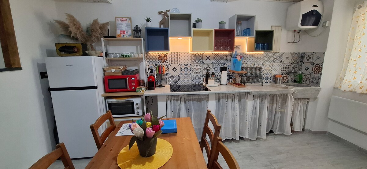 Ronco Scrivia är en liten stad i Genuas inland, belägen mitt i Valle Scrivia, 30 minuter från Genua och färjeterminalen, från Gavi-kullarna, från Serravalle Outlet och Novi Ligure, 1 timme och 50 minuter från Milanos flygplats Malpensa. Vi ligger i den antika romerska gatan i staden, Via Postumia, vi erbjuder en liten privat lägenhet, belägen på bottenvåningen i ett trefamiljshus. Den består av ett utrustat kök, 3 bäddar och ett badrum med dusch. Husdjursvänligt!!!!