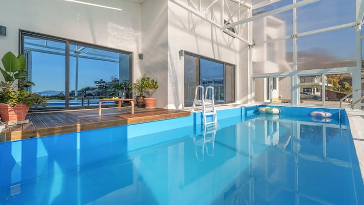 Detta är Ganghwa Narang Stay Pool Villa Pension där endast våra familjemedlemmar kan koppla av och leka i vattnet tillsammans i ett privat privat pensionat med havsutsikt.