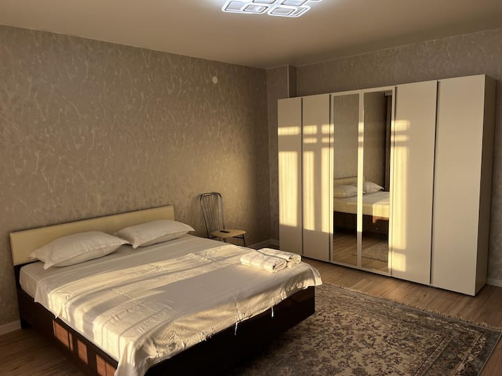 Jag vill välkomna våra gäster, mitt namn är Kuanys, detta är vårt lilla familjeföretag, vars syfte är att tillhandahålla kvalitetsservice och den bekvämaste vistelsen i vår lägenhet! Vi är alltid välkomna gäster, och vi vill vara användbara för dig, vi kommer alltid att berätta var det finns i staden, berätta hur du kommer dit, träffa vår gäst på verandan i vårt hus, tillhandahålla ytterligare föremål för bekvämligheten av din vistelse! Vi väntar på dig!
