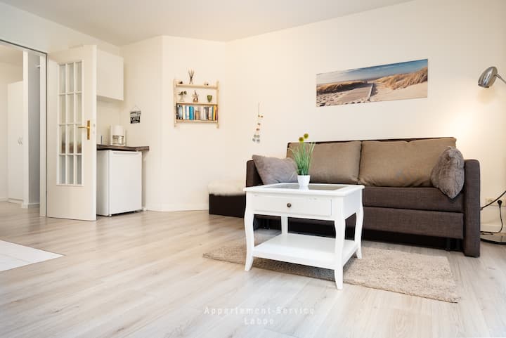 Lägenhet Nautic W08: Mysig 1-rumslägenhet på bottenvåningen, bara 450 m från stranden, perfekt för 1–2 personer. Vardagsrum/sovrum med högkvalitativ bäddsoffa (160 x 200 cm), modernt duschrum, fullt utrustat kök med keramisk spis, ugn, kaffebryggare, vattenkokare och brödrost. Matplats, TV, HiFi-system, WiFi. Terrass med trädgårdsmöbler. Gemensam tvättstuga med tvättmaskin och torktumlare, hårtork, kosmetisk spegel tillgänglig. Husdjur tillåtna. Parkering ingår (duplex