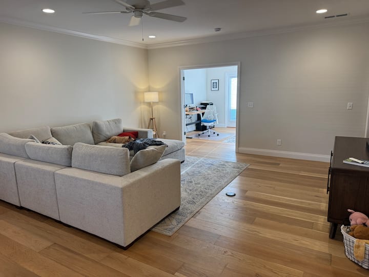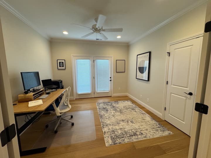 Du kommer att njuta av genomtänkta bekvämligheter, inklusive ett fullt utrustat kök med en espressomaskin, en TV på nedervåningen och övervåningen för att streama dina favoritshower, höghastighets-WiFi och ett dedikerat kontorsområde för distansarbete.