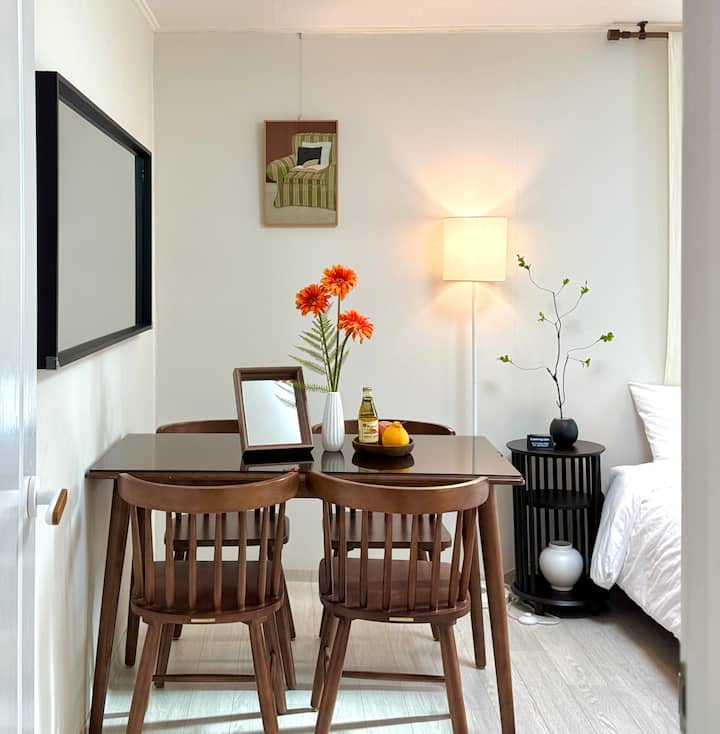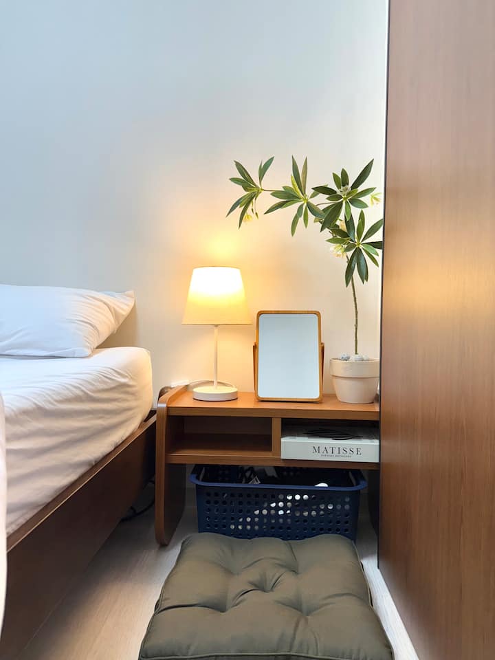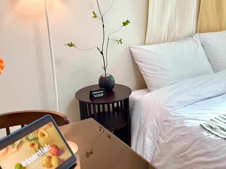 En blandning av varm belysning och naturliga trämöbler, vi hoppas att gäster bara kommer att fokusera på vila, och vi har förberett boendet med tillgivenhet. Till och med de små vaserna, sängkläderna och gardinerna var noggrant utvalda för att hålla stämningen lugn.