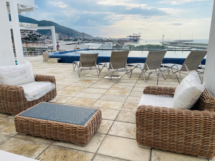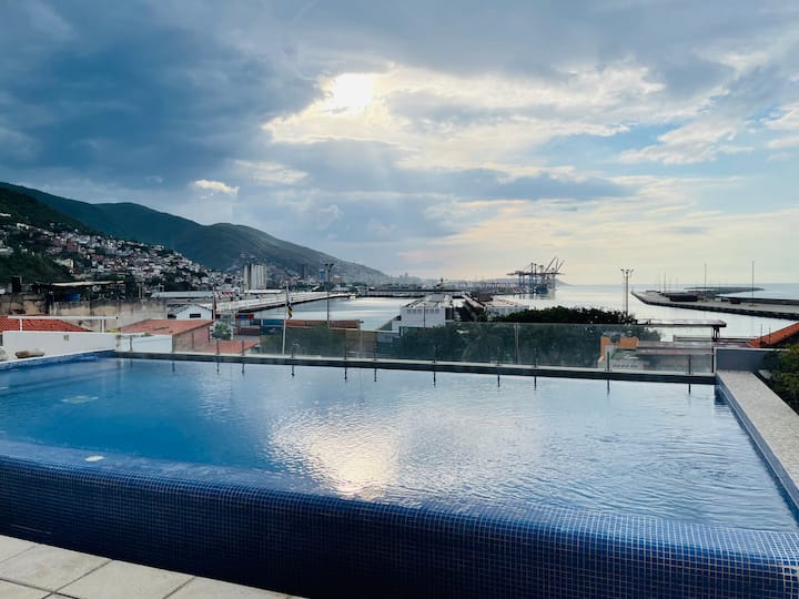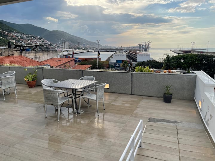 Vår stolthet och glädje väntar dig på hotellets tak: La Guairas första takpool, ett unikt utrymme med panoramautsikt över Karibiska havet, hamnen i La Guaira och de färgglada koloniala taken i det historiska centrum. Tiden verkar stanna här. Koppla av på en solstol, njut av den tropiska solen eller upplev en oförglömlig solnedgång på vår takbar, där cocktails kombineras med glöden av den karibiska himlen.