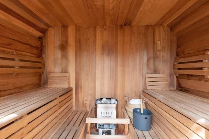 Bortom glaset väntar din privata spahelgedom: en bubbelpool, cederbastu och kall dykpool (sommar) inom räckhåll för de viskande tallarna, med ett eldbord och utomhuslounge som inbjuder till stjärnfyllda kvällar.