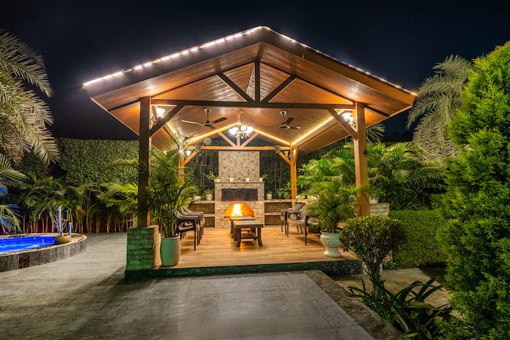 En rymlig 4-BHK villa med fyra mysiga sovrum med luftkonditionering, ett fullt utrustat kök och ett varmt vardagsrum med bardisk och utsikt över trädgården. Njut av en egen pool med, ett lusthus vid poolen och gott om utrymme för fester. Boendet erbjuder en cricketplan, TT-bord, badmintonområde, lekzon för barn och lugnande vattenförekomster. Beläget nära The Grand Venice Mall och Gurjar Samrat Mihir Bhoj Park.
