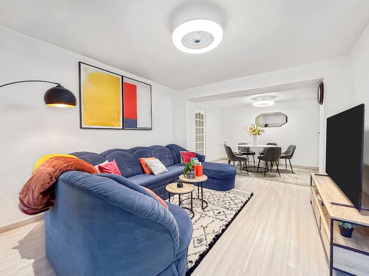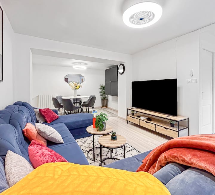 Ett mysigt vardagsrum 🛋️ med en stor bäddsoffa för dina stunder av avkoppling, en TV med en smart TV 📺 och ett bekvämt matbord för 6 personer🍽️, perfekt för att dela dina måltider eller förlänga kvällen runt en bok📖.