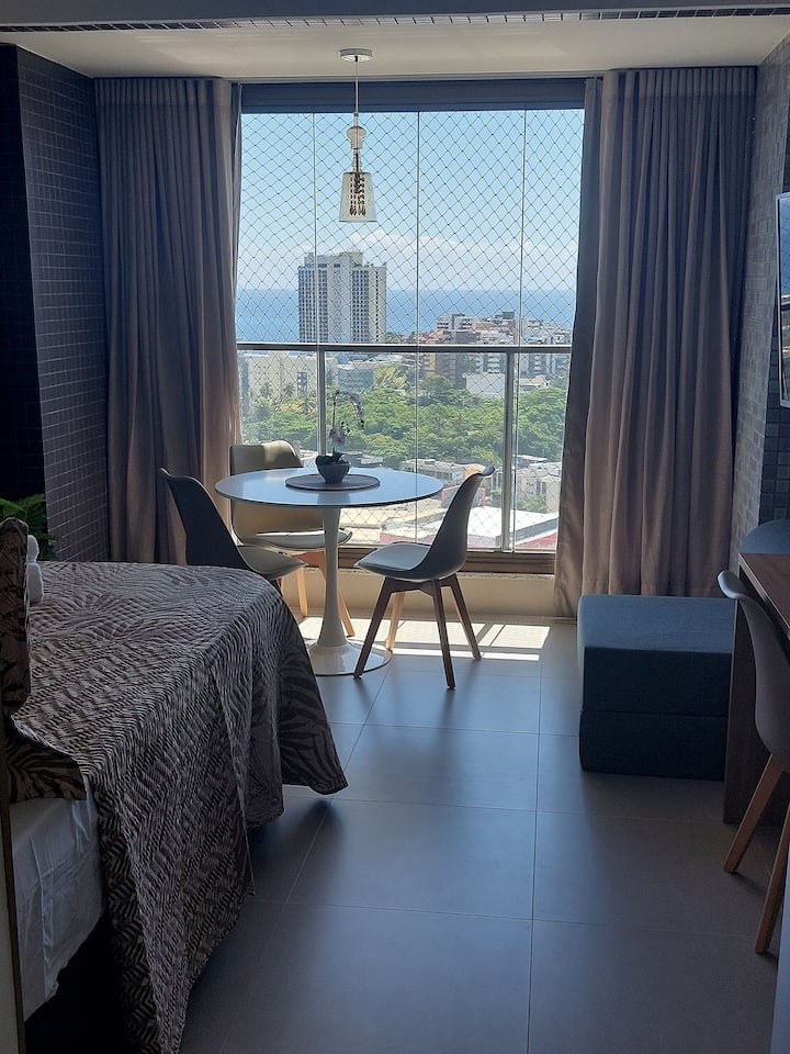 Njut av upplevelsen av att bo i en modern och mysig studio, perfekt för stunder av vila, arbete eller fritid. Beläget på ett högt golv och med en östlig position, har utrymmet en privat balkong och en charmig utsikt över havet, vilket ger komfort, praktiska och en minnesvärd vistelse i Rio Vermelho, en av de mest önskvärda stadsdelarna i Salvador.