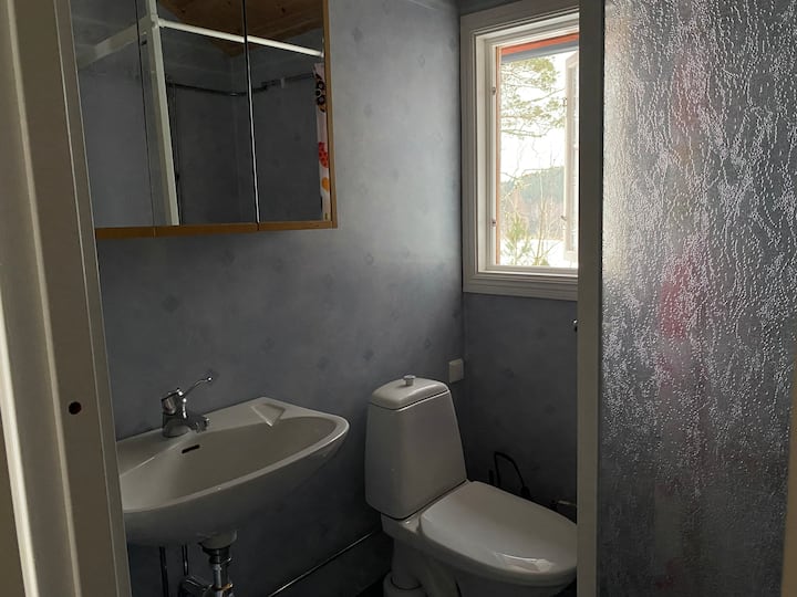 Toalett med dusch. Tvättmaskin finns i vårt servicehus intill. Tv med ett basutbud av kanaler.