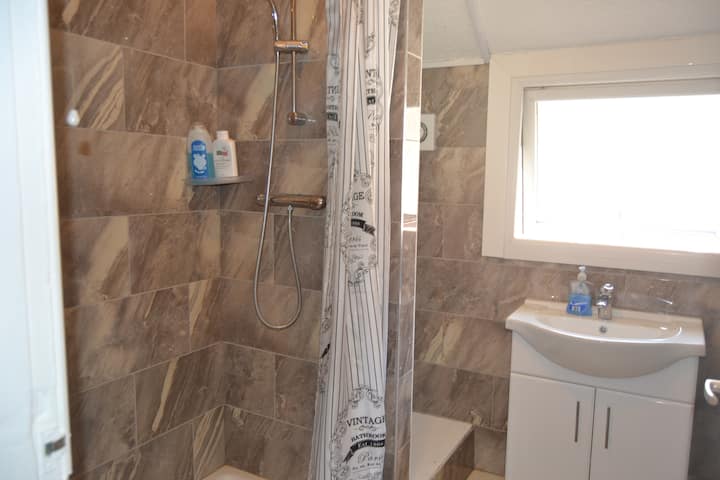 Delad toalett och dusch ligger på samma våning. Varje korridor har delad toalett och duschrum. Sammantaget finns det 4 toaletter och duschrum och du har tillgång till alla (bottenvåning, bottenvåning och 2: a våningen).