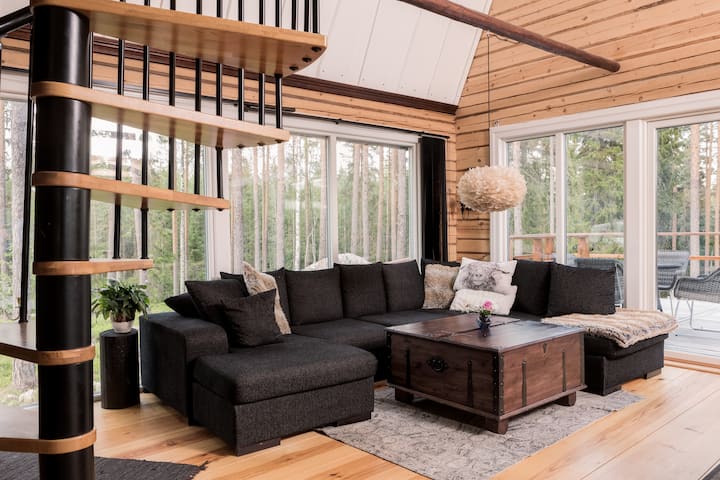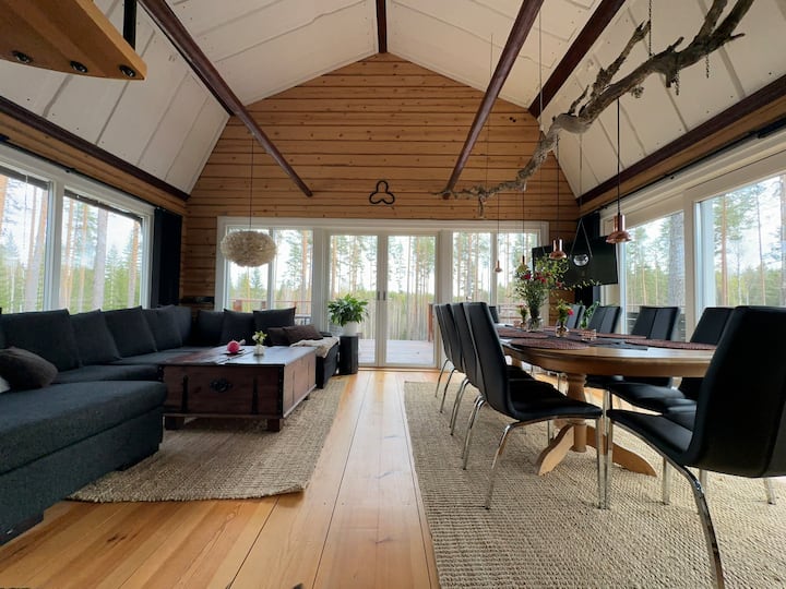 Mitt i skogen, perfekt för 2-6 pers. Nybyggt, unikt designat hus. Hela boendet för er själva. Stora glaspartier ger känslan att vara ute i skogen trots att du är inomhus med dagens alla bekvämligheter. Skogens djur är precis utanför. 4 sängar i storstugan, 6 sängar i ett enklare hus bredvid.