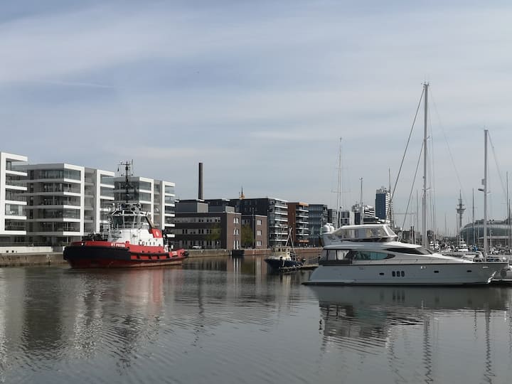 Hej, jag heter Stefan och har hyrt denna nya lägenhet för 4 personer direkt vid Neue Hafen (seglingshamn) i centrum av Bremerhaven sedan januari.