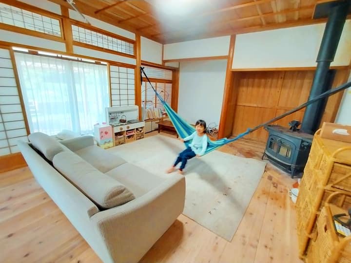 Privat hus att hyra.Ett värdshus där du kan leka med barn.En plats där du kan koppla av med din familj med en vedspis, ett vedbad, leksaker och hängmattor.