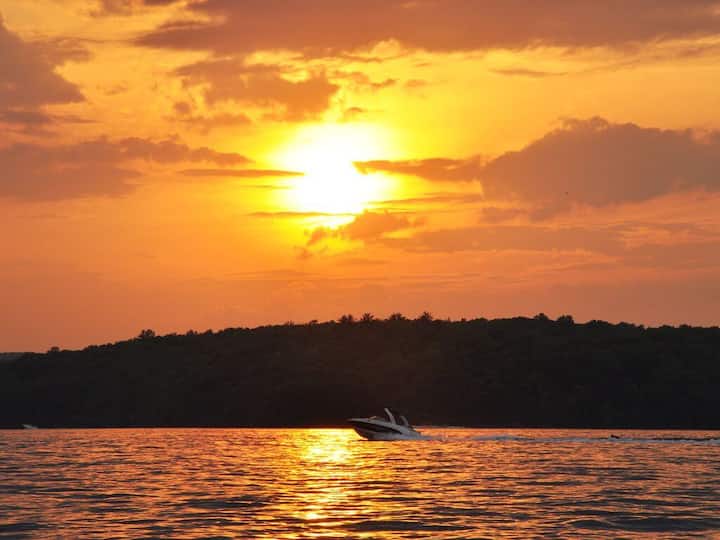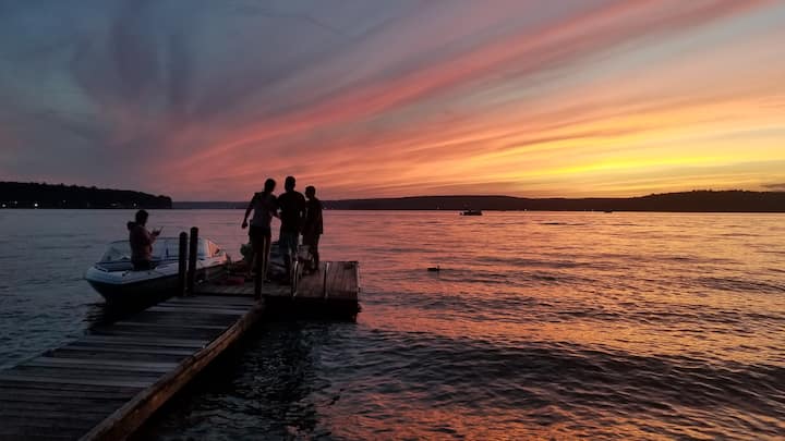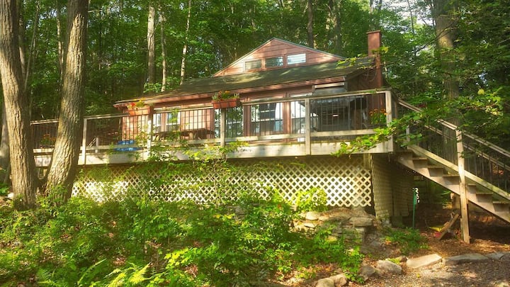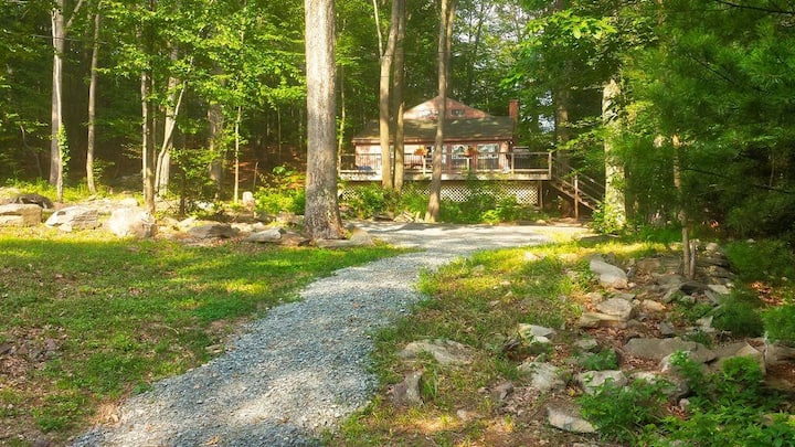 Vår stuga ligger nära slutet av en liten privat väg i en naturlig miljö under ett trädtak av stora träd. Det finns endast 4 andra hus på den privata vägen och ett är vår Sunset View Chalet. Inställningen är mycket privat för Lake Wallenpaupack. Huset ligger ca. 200 meter från sjön, med en privat stig som tar dig till bryggan, som delas med våra chaletgäster. Det finns också en privat sittgrupp vid sjön med Adirondack-stolar och ett picknickbord.