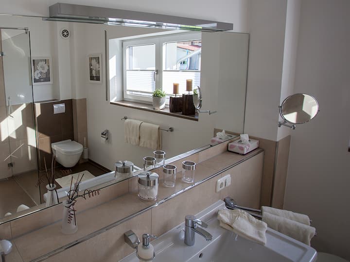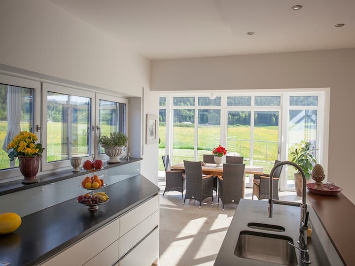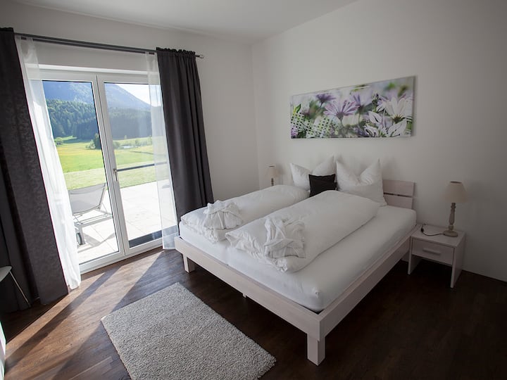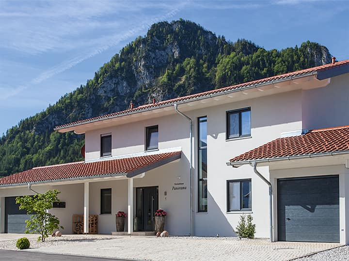 Vårt semesterhus "PANORAMA" erbjuder en exklusiv upplevelse! Två separata lägenheter, en med 2 sovrum/1 badrum den andra 3 sovrum/2 badrum, bastu i huset och bubbelpool utomhus. Fantastisk utsikt över bergen i Inzell.