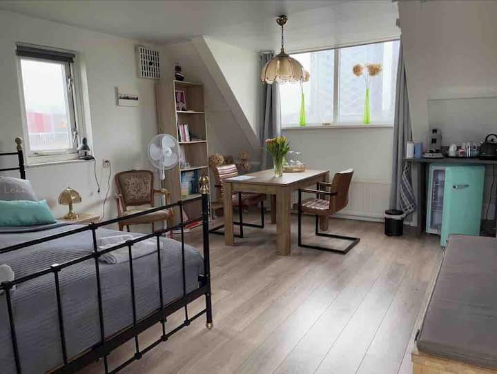 Rymligt rum med utsikt över vattnet nära Amsterdam