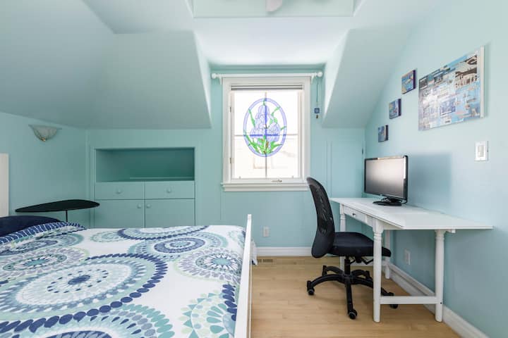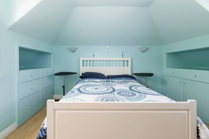 Vårt Sky-rum, är ett rum att drömma i! Lätt och luftigt, med stora fönster mot både öster och väster. Det är ett rum på övervåningen som känns som ett tornparadis. Dubbelsäng har en helt ny Sealy posturpedic madrass. Massor av lådor och förvaringsutrymme. Rummet är nymålat och inrett med originalkonst och är utrustat med ett bibliotek om Palo Alto, födelseplatsen för Silicon Valley. Om du behöver det har rummet massor av förvaring - sex mycket stora lådor en liten garderob. Badrummet bredvid delas med ett annat gästrum, men det finns två andra badrum i huset och därför inga konflikter.