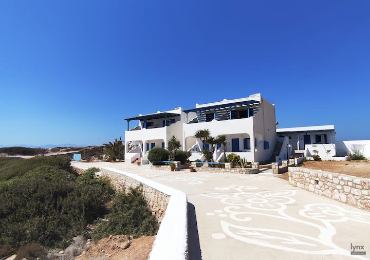 Byggd enligt cykladisk arkitektur, välkomnar de dig i en mysig miljö med autentisk gästfrihet på ön och familjestämning.