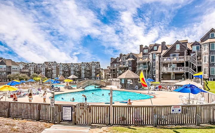 Fördelarna med denna resort är de övergripande bekvämligheterna, inklusive ett av de största utomhuspoolområdena på OBX, privat gästtillgång till en trevlig strand och ett rekreationscenter som erbjuder en inomhuspool, bubbelpool, träningsrum och aktivitetsrum.