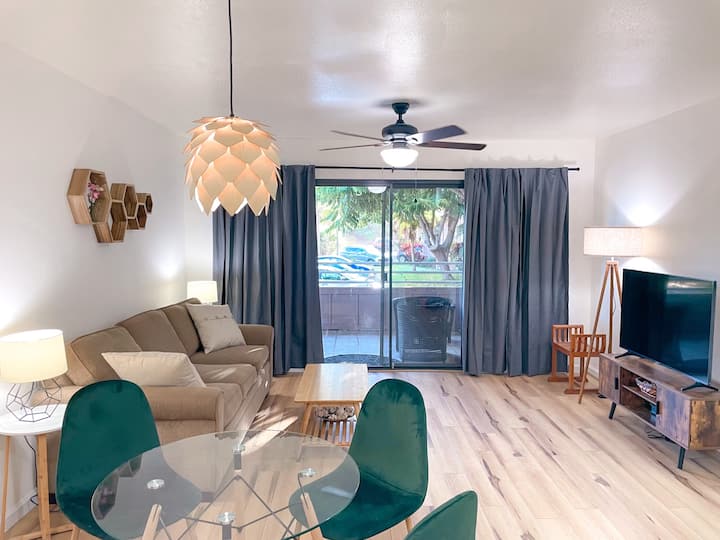 Nyuppdaterad ren lägenhet med luftkonditionering! <2 min till stranden!