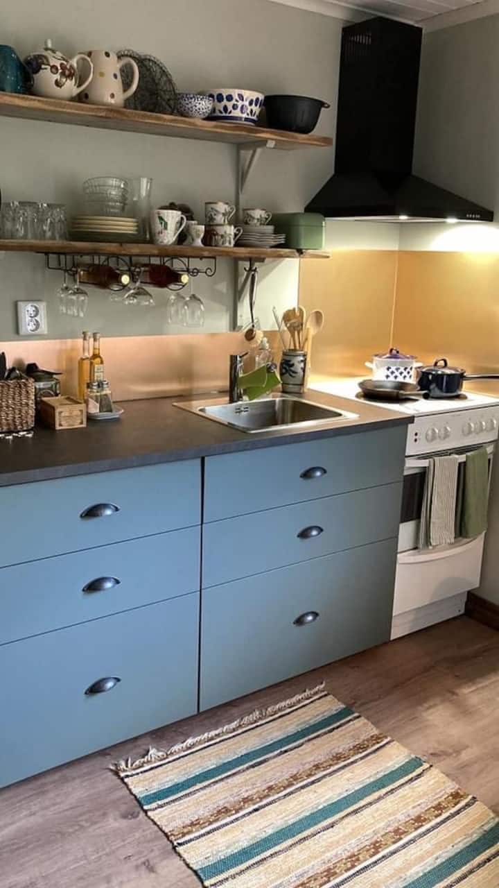 Jag är en färgglad kvinna som hyr ut gästhuset som jag och min man har byggt. Inredningen är starkt påverkad av min förkärlek till second hand och återbruk. Jag älskar att odla så blommor får Du njuta av efter säsong.