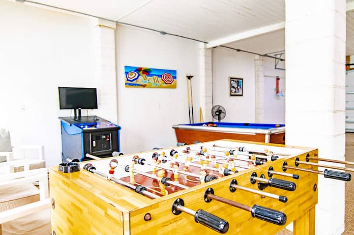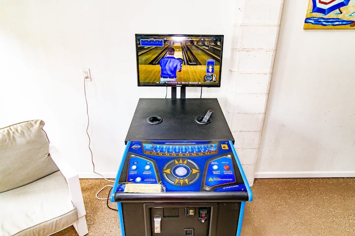 SPEL SPEL! Det finns inget annat hem som detta! Njut av ett biljardbord, ett fotbollsbord, en flippermaskin, en bowlingmatch och till och med en puttinggreen! Huvudspelområdet ligger i det slutna garaget på bottenvåningen - nära poolen. Flippermaskinen är på andra våningen, och puttinggreenen är utomhus vid poolen.