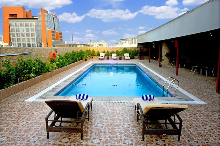 Detta är ett av få boenden i området med pool.